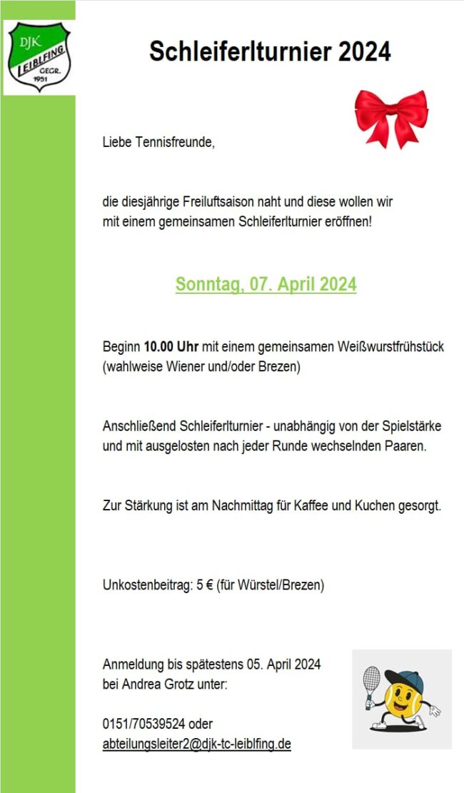 Saisoneröffnung am Samstag 07.04.24 mit anschlie0endem Schleiferlturnier. Wir freuen und auf euer kommen.