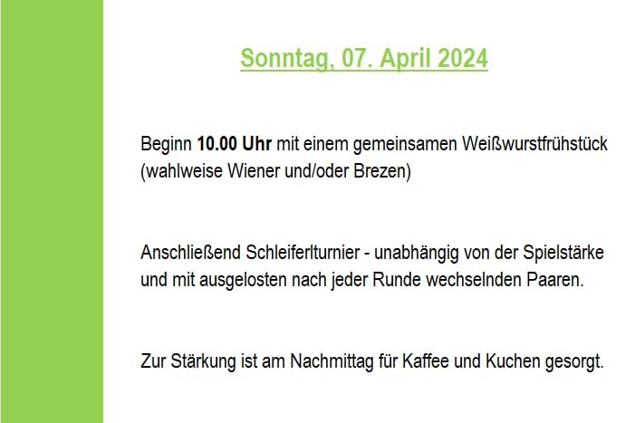 Saisoneröffnung am Samstag 07.04.24 mit anschlie0endem Schleiferlturnier. Wir freuen und auf euer kommen.